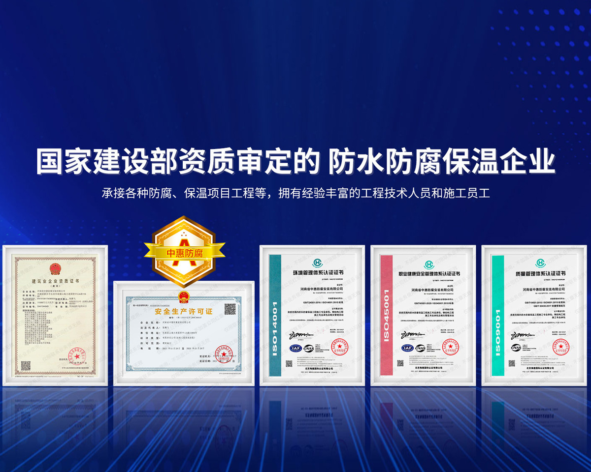 公司經營范圍:防水防腐保溫工程;消防設施工程;建筑裝修裝飾工程;建筑機電安裝工程;電力工程;建筑工程;石油化工工程;工業清洗工程;油罐清洗工程;鋼結構工程;環保工程;模板腳手架工程;電纜防火封堵、防污閃噴涂、外墻外保溫工程;各類施工勞務作業;設備維修、船舶鉚焊、涂裝;電力工程材料、建材、防水材料、防火材料、防腐保溫材料銷售,并相繼通過了GB/T19001-2008idtISO9001:2008GB/T50430-2007質量管理體系認證證書。GB/T24001-2004idtISO14001:2004環境管理體系認證證書。GB/T28001-2011idtOHSAS18001:2007職業健康安全管理體系認證證書。公司是中國防腐蝕于防護協會、中國施工企業管理協會、電力協會和中國鋼結構防水協會會員單位。 公司的經營業務涵蓋了石油、化工、電力、冶金、煤炭、船舶、國防、燃氣、水利、環保、交通運輸、航空及國防軍工和輕紡市政等行業的防腐保溫絕熱設備。鋼結構安裝、防火、防水、金屬噴鍍、聚脲噴繪、陰極保護、防滲透堵漏、玻璃鋼及各種磚版材料襯里、橡膠襯里、煙氣硫和耐酸溶劑腐蝕等工程施工。公司連續十年榮獲“省市先進施工企業”“安全生產先進單位”“重合同,守信用企業”和“AA***資質企業”的稱號。2000年被命名為市級文明單位,2002年被國家工商行政管理局命名為“重合同,守信用的企業”、被中國工業防腐蝕技術協會命名為“防腐蝕企業,能源節約及環境保護領域有豐富的經驗和***的業績。工程一次交驗合格率100%。其中攀枝花鋼鐵公司煉鐵廠四號高爐及熱風爐防腐工程、上海寶鋼公司煤氣柜防腐工程、撫順石油一廠裝置防腐項目、齊魯石化公司稀烴廠高塔防腐工程、吉林化學工業公司煉油廠油罐防腐工程、天津石化熱電廠六號爐頂棚聯絡管保溫工程、大慶油田(太倉)力神泵業工程、中國化學工程第十一建設工程、中原油田勘探局工程、中國石化銷售有限公司華北分部、魯皖輸油管道工程、貴州開磷息烽合成氨工程、陜西黃陵煤化工程、中國石油天然氣西部管道塔里木輸油工程、邯鋼集團邯寶鋼鐵公司煉鐵工程、德州供電工程、吉寶(南通)船廠工程,偃師華潤熱力工程、鄭州熱力總公司。 河南省中惠防腐安裝有限公司愿以豐富的施工經驗,***的技術,***的設備,***的管理,***的服務,竭誠為國內外廣大的用戶提供***滿意、******的工程作品。 我公司愿與國內外同仁一道,團結協作,共同推進防腐蝕行業發展! 公司地址:河南省長垣縣建設路北段360號 固定電話:0373-8866488 郵編:453400 網址:http://www_zhff_com_cn.tjwanguojiadian.com